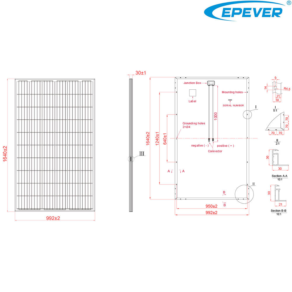 - ابعاد: 1640 × 992 × 30 میلیمتراین ابعاد استاندارد، نصبی آسان را در سیستمهای خورشیدی فراهم میکند.